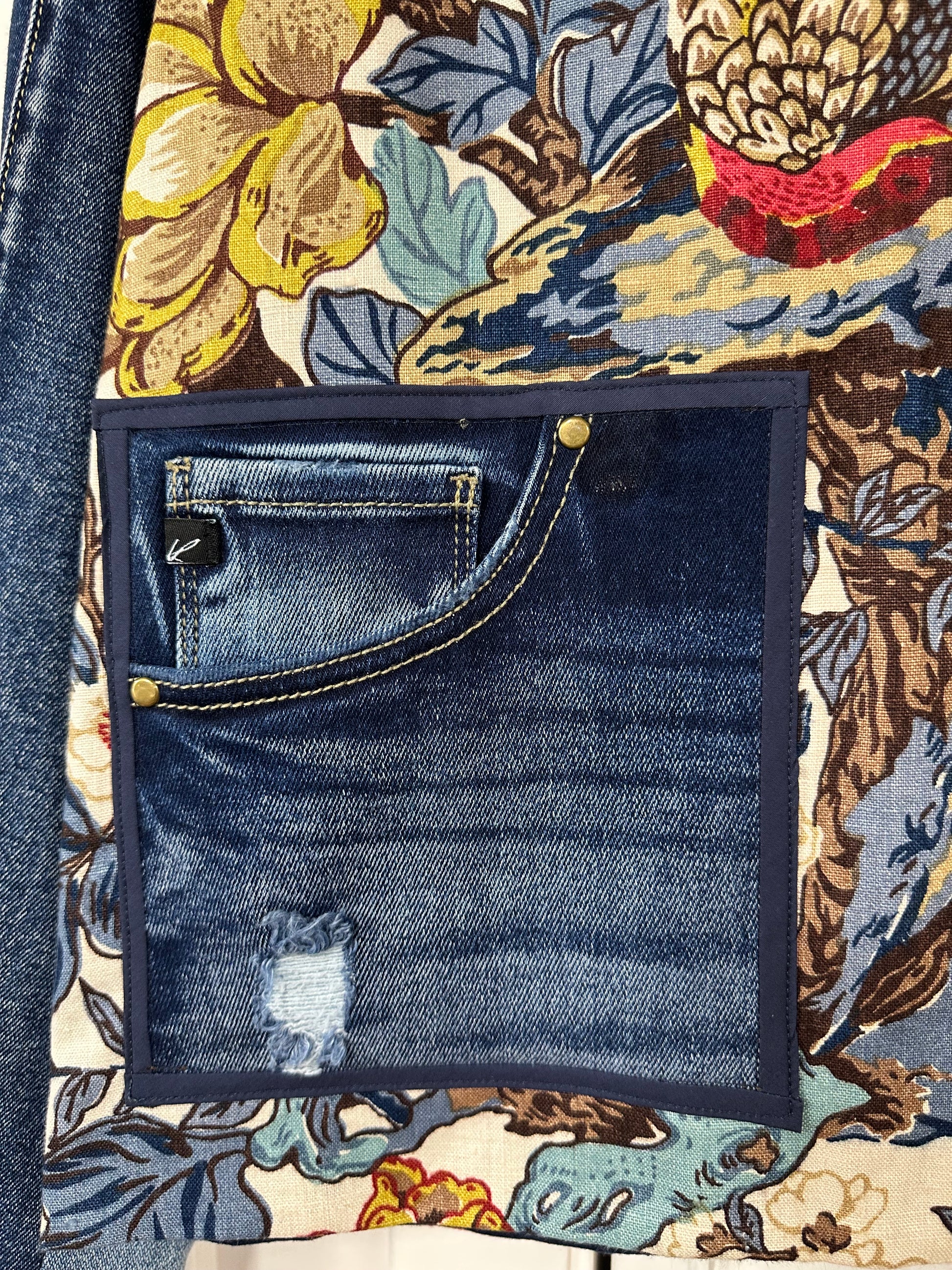 This jacket features a vintage hand printed fabric remnant and upcycled denim. It is fully lined, has unique front pockets and a zipper front.