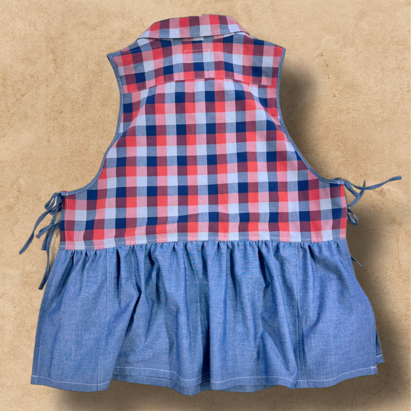 This Janelle blouse was made using an upcycled plaid shirt and parts of a chambray shirt as the peplum.